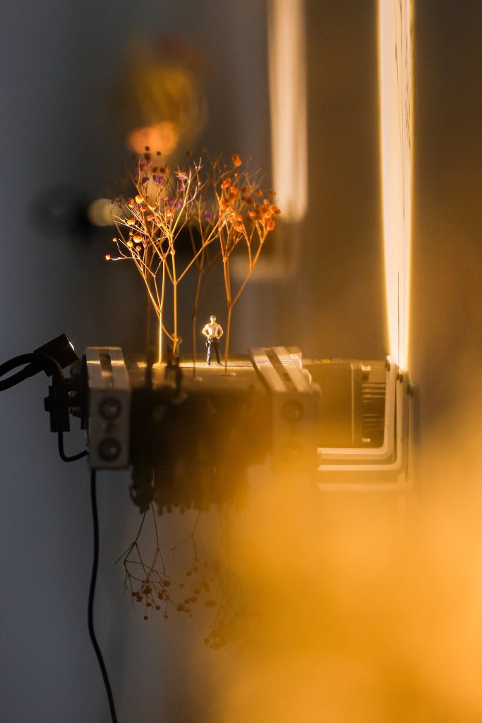 Gabriel Lester, Small People, Big Shadows, 2024, conveyor, tree models, figurines, 45 × 50 × 46 cm