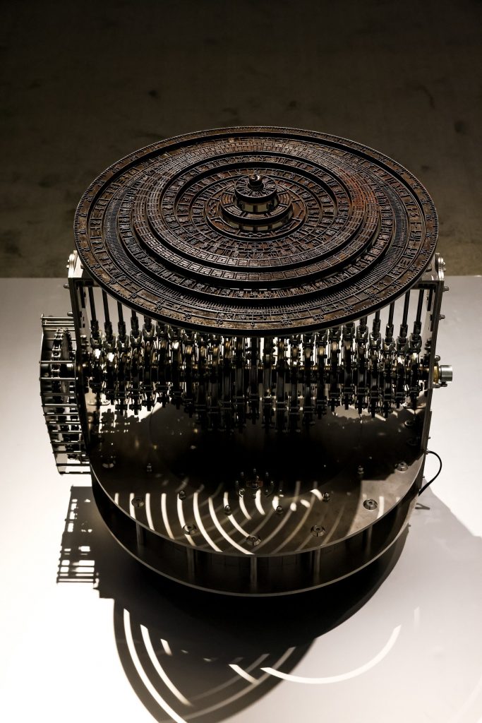 Based on calendar systems derived from sky-watching and agricultural time, the work embeds yin-yang lunisolar principles in concentric rings. It is Merging natural ripple patterns with compass-like forms, a mechanical transmission simulates wave dynamics. As the device runs, rings inscribed with celestial symbols rise and overlap like waves, suggesting a link between subtle variation and grand cosmic order and inviting reflection on natural laws within traditional Chinese cosmology.