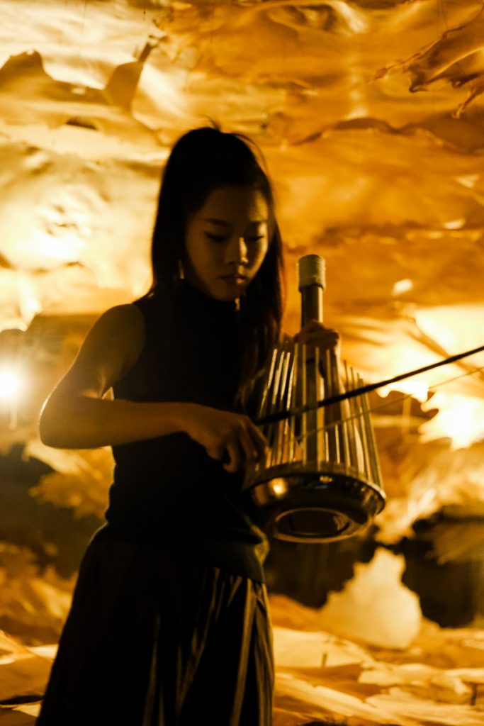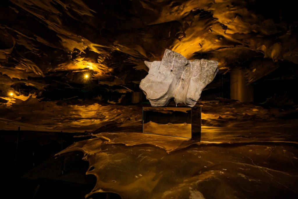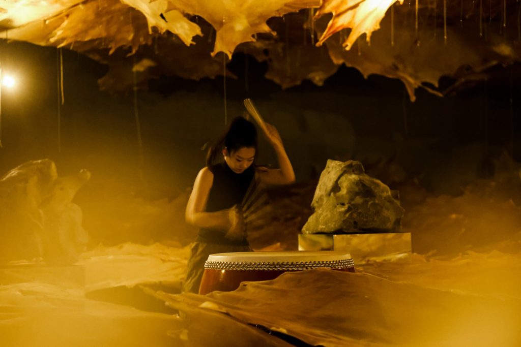 This large-space installation draws on the myth of Nuwa patching the sky. Using raw cowhide, natural stone, and mixed media with instrumental performance, it focuses on the moment just before cosmic order is restored.