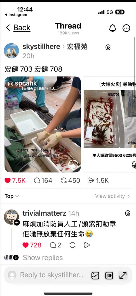 The next day, as the fire weakened, firefighters entered for rescue. Good news came one after another as residents were saved. What moved me most was that they also rescued many animals: a 15-year-old dog, an 18-year-old cat, a parrot, and even a snake, a turtle, and a tank of goldfish… I was deeply moved. I have pets myself, and I know they are never “just animals,” but irreplaceable family.
