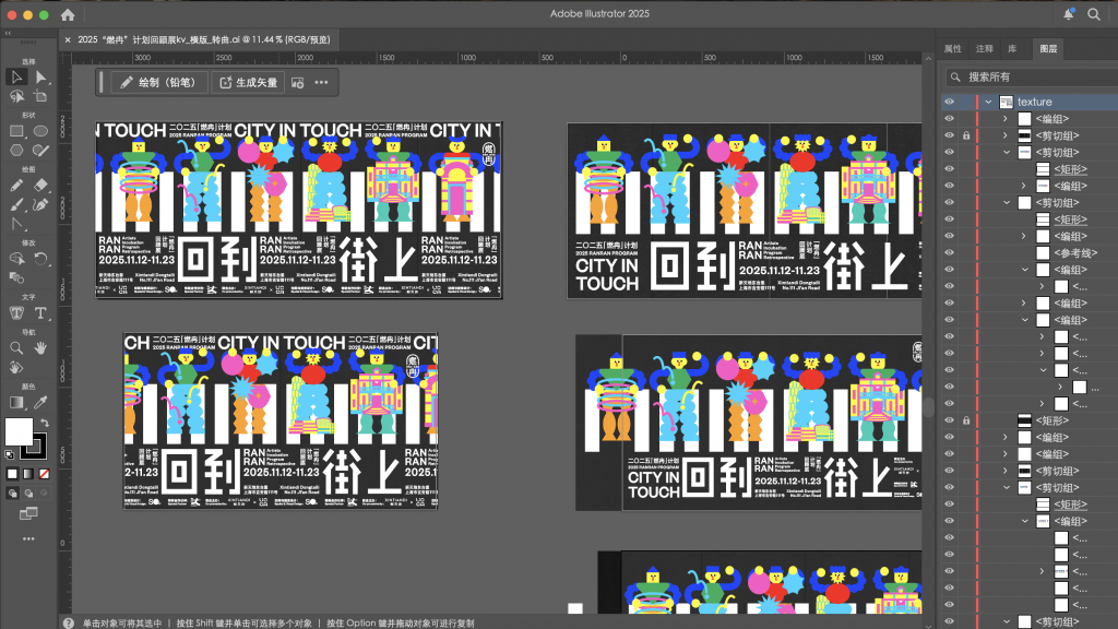 From 12 to 23 November 2025, the closing project, “Ranran 2025 – City in touch!”, took place at Dongtaili in Shanghai Xintiandi. The event reviewed the three years of work. It consisted of a retrospective display and a forum: we built a memory wall of objects from past projects, designed cartoon characters for 31 artists based on their works, produced matching merchandise and sculptural pieces, and invited six experts to discuss art and urban culture.